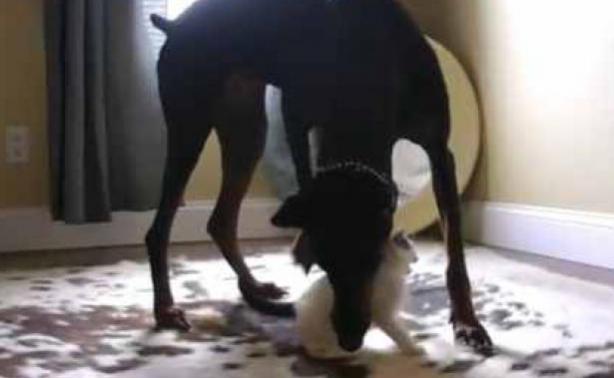 Το Doberman βάζει το γατάκι στο στόμα του! Το μικρό γατάκι ήθελε να παίξει λίγο με τον καινούργιο του φίλο... Μόνο που δεν ήξερε ότι εκείνος δεν είχε όρεξη για παιχνίδια....