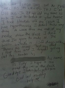 Εγραφε: "Όποιος διαβάζει αυτό το σημείωμα να ξέρει ότι πεθαίνω. Είμαι 28 χρονών και με λένε Μάϊκ. Έπρεπε να μπω στο σπίτι σας. Πήρα κάτι κουβέρτες από τον καναπέ. Έχω υποθερμία. Δεν πήρα τίποτε άλλο. Ενα κύμα με παρέσυρε μέσα από το σπίτι μου στ΄ανοιχτά. Το νερό έξω είναι 3 μέτρα. Δεν υπάρχει ελπίδα να σωθώ. Πείτε στον πατέρα μου ότι τον αγαπώ και ότι προσπάθησα. Ο αριθμός του είναι ###############. Το όνομά του είναι Τόνι. Ελπίζω να βγάζετε νόημα από αυτό γιατί γράφω στο σκοτάδι. Πήρα και ένα μαύρο μπουφάν. Αντίο. Ο Θεός να με βοηθήσει."