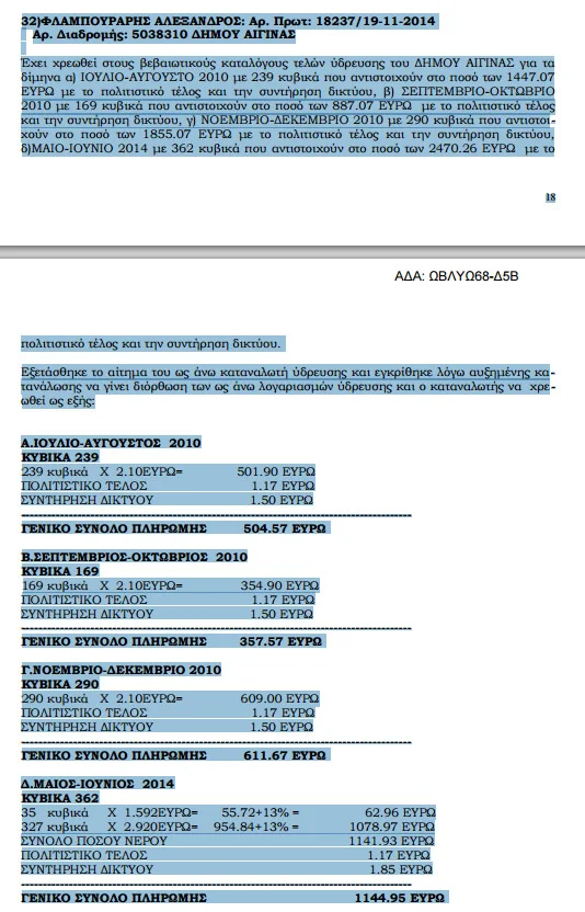Σύμφωνα με τον δήμαρχο Αίγινας, ωστόσο, η διατύπωση «λόγω υπερβολικής κατανάλωσης είναι λάθος» και το «κούρεμα» έγινε επειδή το αίτημα θεραπείας που υπέβαλε ο υπουργός Επικρατείας ήταν ειλικρινές.
